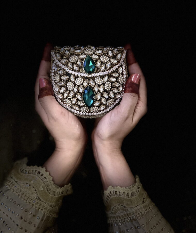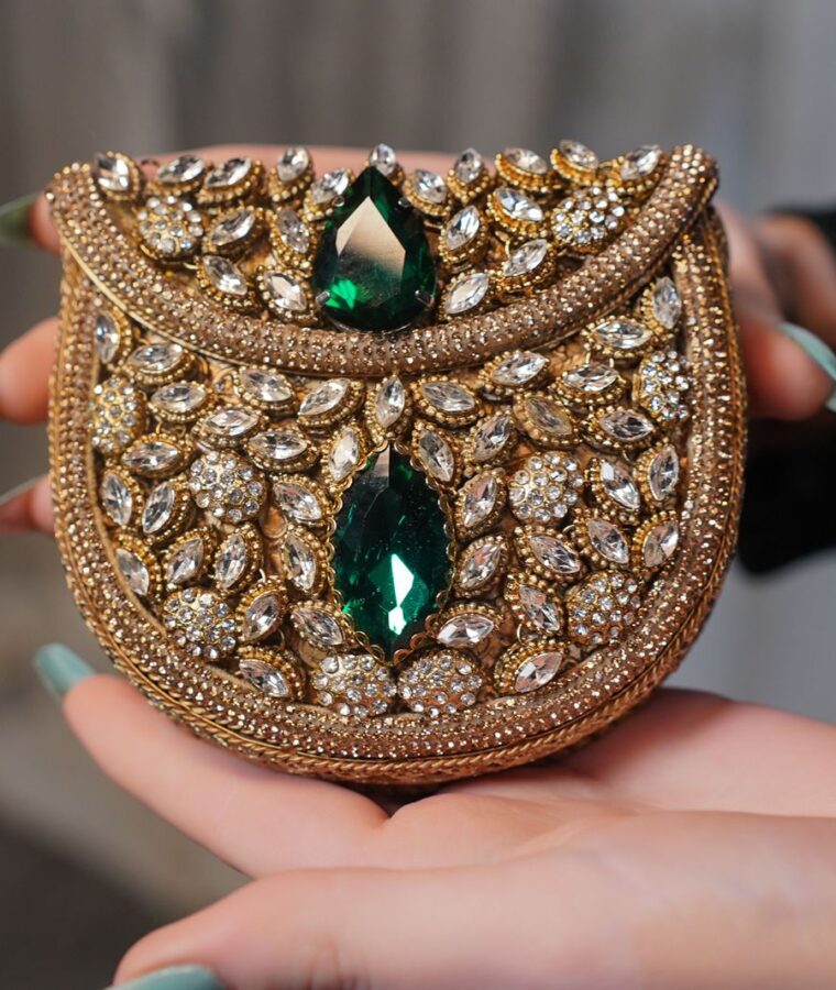 Rang-e-Sitara – Red, gold & green kundan mini clutch